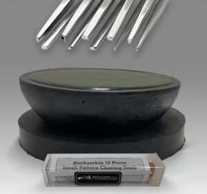 The items in this kit provide a solid small chasing tool set up. A heavy iron pitch bowl with support ring, pitch, and a set of small pattern Nechamkin Chasing Tools, gives you nearly everything you need for a solid start with chasing and repousse. *We also have a kit with all this plus a Nechamkin Pistol Grip Chasing Hammer!